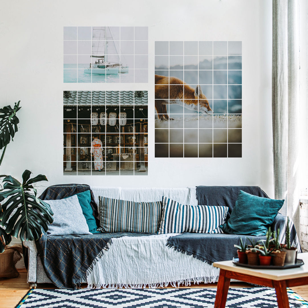 We print your photos in HD colour onto a fine weave, subtle textured fabric. This special material has a beautiful satin finish, doesn’t damage your walls and can be easily removed and repositioned many times over. No more nails, no more alignment & spacing headaches, no more damaged walls!
